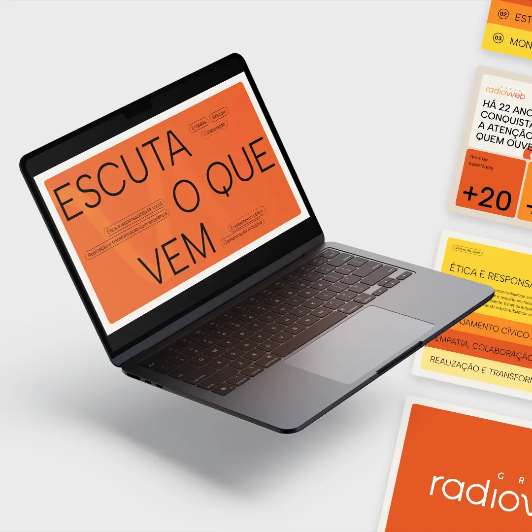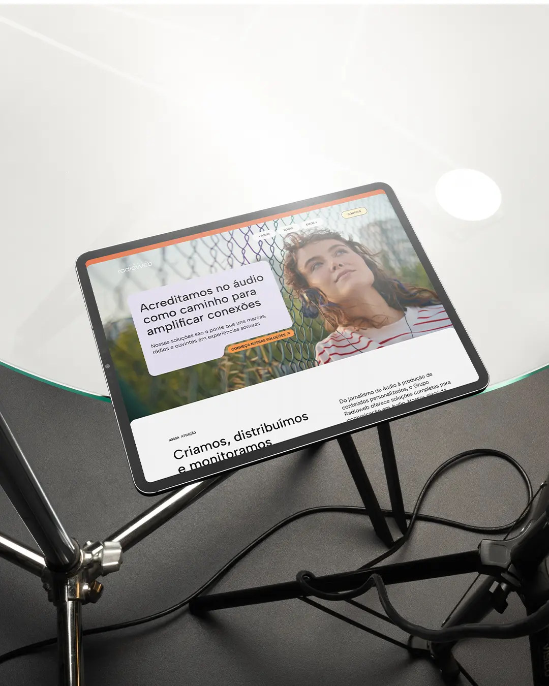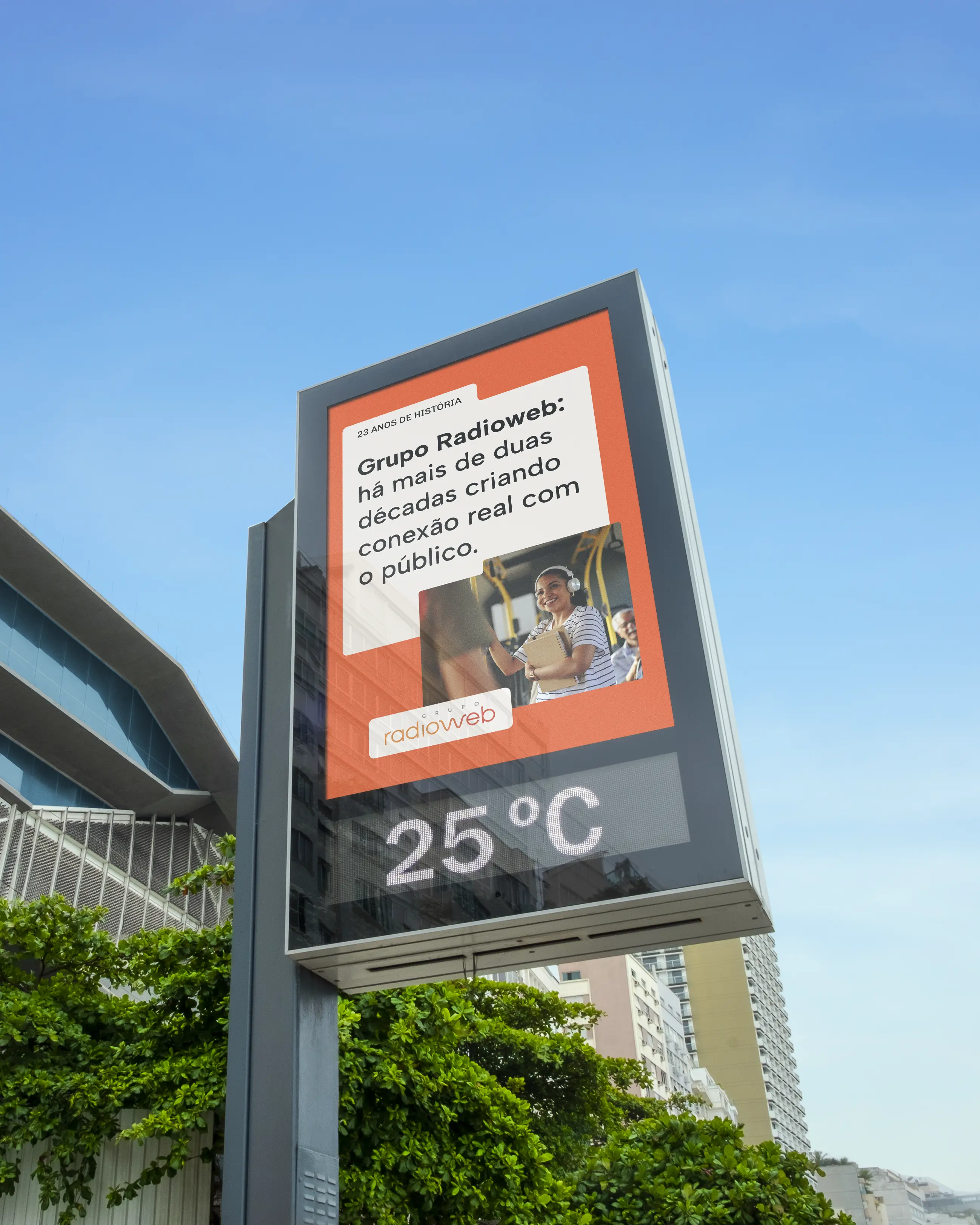 Na nova identidade visual, adotamos uma estrutura modular e blocada que sustenta uma comunicação dinâmica e intuitiva em diferentes formatos e aplicações. O resultado é uma linguagem que traduz o ritmo e a fluidez do áudio, reforçando a presença contemporânea e inteligente da marca.