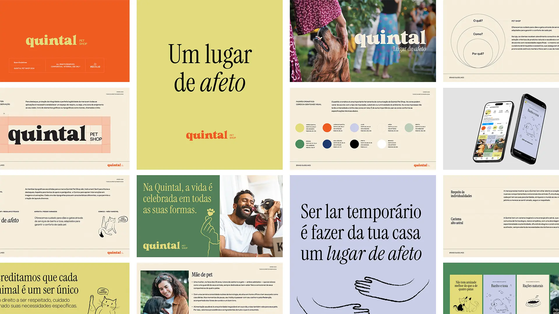 Atuando de forma colaborativa, participei de todo o processo de posicionamento e estratégia da marca, reunindo insights para que a identidade visual refletisse os pilares da Quintal. A linguagem visual da marca tem como ponto de partida a alegria de ter um pet como companheiro para todos os momentos. Palavras como acolhimento, diversão e leveza guiaram cada etapa do desenvolvimento. A tipografia do logotipo combina traços orgânicos e fluidos com uma forma mais contida e estruturada, criando um equilíbrio entre carisma e profissionalismo. Para tornar a linguagem ainda mais rica, foi desenvolvido um conjunto de ilustrações criadas exclusivamente para a marca, adicionando singularidade e personalidade para a comunicação visual da Quintal.